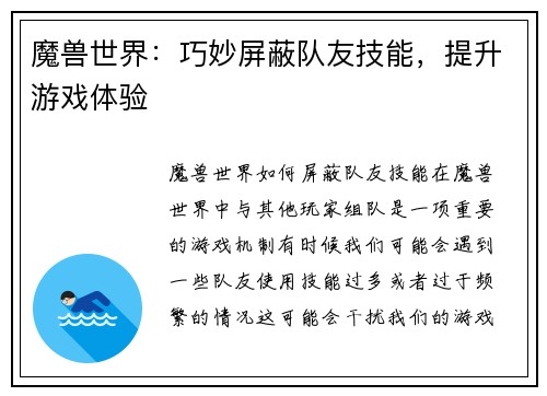 魔兽世界技能栏的重要性 魔兽世界是一款非常受欢迎的大型多人在线角色扮演游戏,玩家在游戏中可以扮演不同职业的角色,与其他玩家一起探索广阔的游戏世界。在游戏中,技能栏是非常重要的一个界面,它可以帮助玩家快速使用各种技能和物品。本文将详细介绍如何拖拽技能栏,以便更好地应对各种战斗和任务挑战。j9九游会真人n...