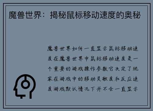 一、了解魔兽世界画面分辨率的概念 在开始调整魔兽世界的画面分辨率之前,我们首先需要了解什么是画面分辨率。画面分辨率是指显示设备上像素的数量,通常用宽度和高度的像素数量表示。例如,1920x1080表示宽度为1920像素,高度为1080像素。画面分辨率越高,图像越清晰,细节越丰富,但同时也需要更高的显卡性能来支持。 二、选择合适的画面分辨率 选择合适的画面分辨率是调整魔兽世界画面的第一步。较高的分辨...